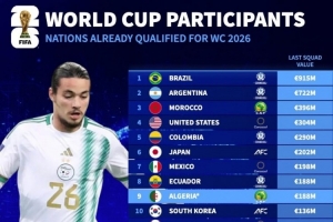 体育资讯10月10日讯 德国转会市场统计了锁定2026年世界杯参赛资格球队的球员身价(上期名单之中的球员),并列出榜单,巴西居首,阿根廷次席。