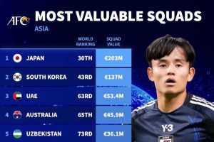 体育资讯10月12日讯 德国转会市场网公布亚洲国家队身价排名,日本队以2.03亿欧元总身价领跑,韩国队以1.37亿欧元位列第二,两队身价在亚洲形成明显第一集团。
