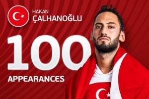 恰尔汗奥卢迎来土耳其国家队100场里程碑,总共贡献21球18助