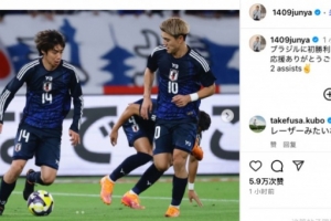 久保建英、三笘薰、长友佑都为这条社媒点赞,久保建英还评论道:“你的传中如激光般精准。”