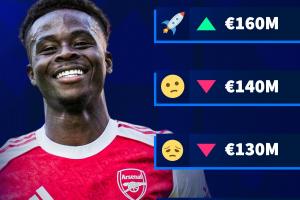 涨还是跌?德转预热萨卡身价变动:最低1.2亿欧最高1.6亿